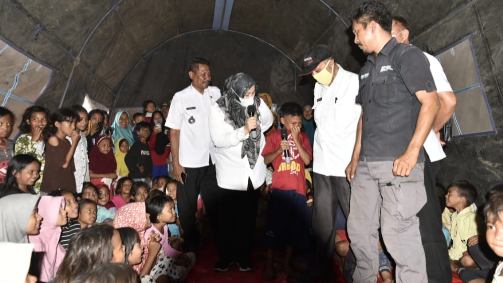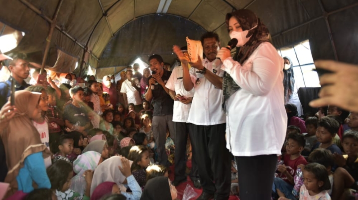 Bimantika.net Suasana riang tampak ditenda pengungsian sementara warga terdampak kebakaran di RT 11 dan RT 12 Desa Naru Barat Kecamatan Sape Rabu (13/10) saat Bupati Bima Hj.Indah Dhamayanti Putri SE (IDP) berbaur dengan anak-anak sekolah dan warga.
