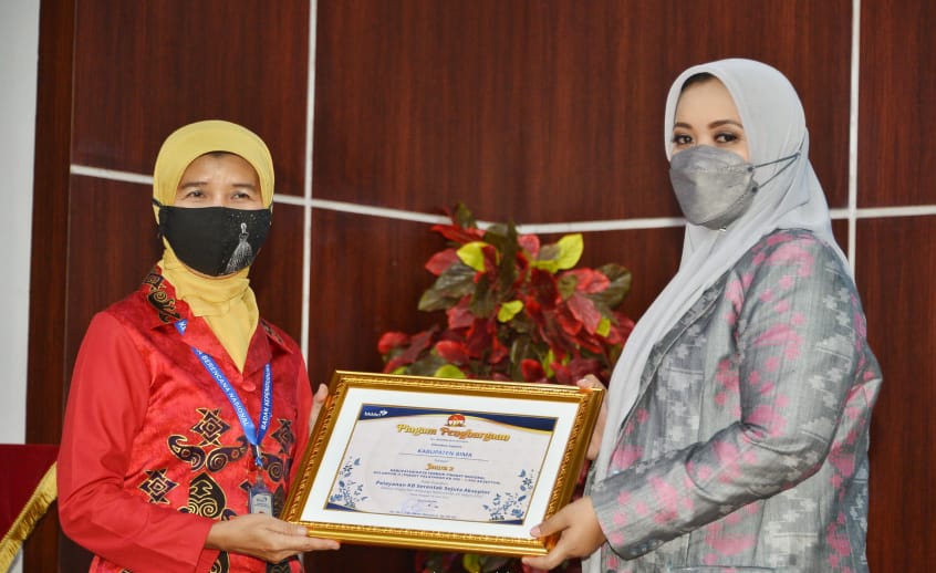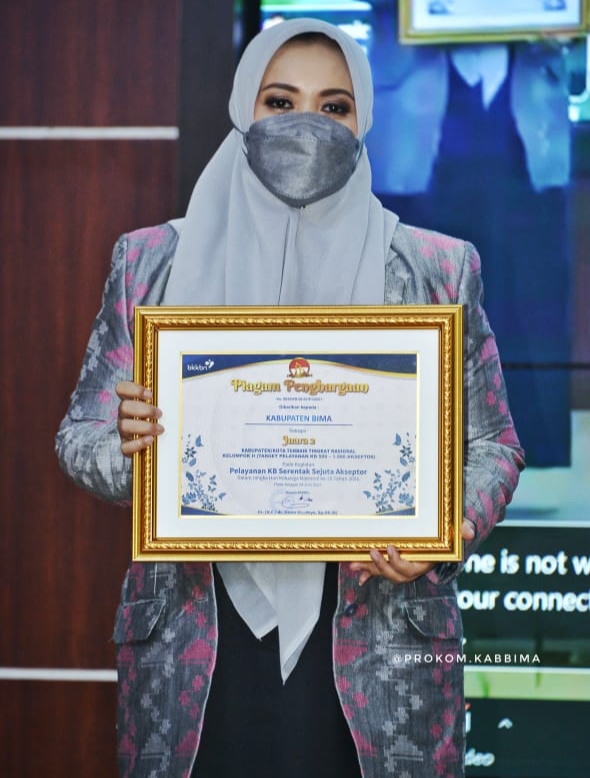 Bimantika.net Bupati Bima Hj. Indah Dhamayanti Putri, SE (IDP) Senin (27/9) menerima secara langsung penghargaan sebagai Juara II Kabupaten/Kota Terbaik Tingkat Nasional Kelompok Target Pelayanan KB 500-1.500 Akseptor pelayanan KB serentak pada Pencanangan Kegiatan Pelayanan Keluarga Berencana dan Kesehatan Reproduksi Bersama Mitra Kerja Tahun 2021.