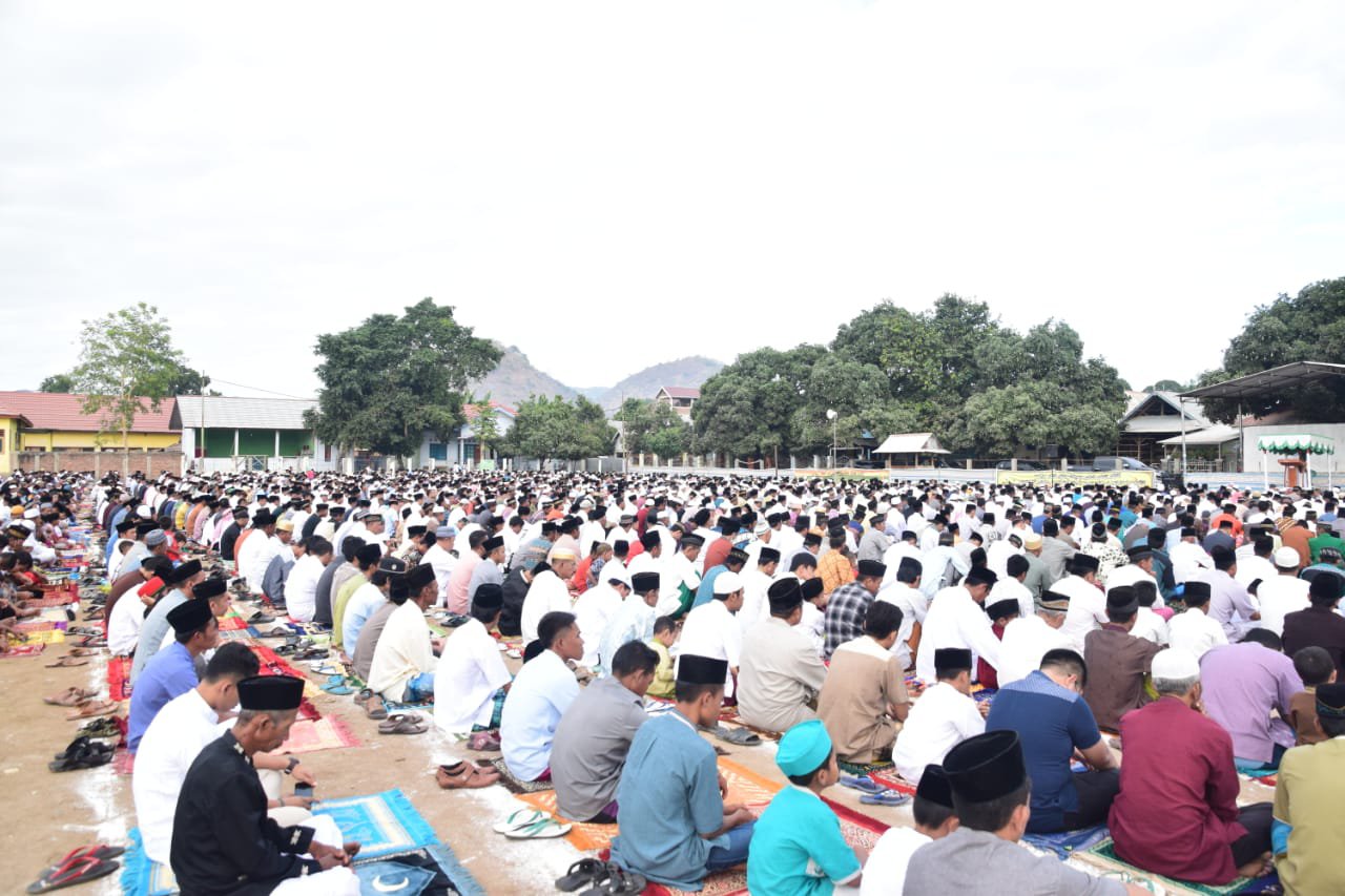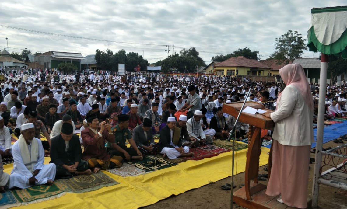 “Setiap peristiwa yang mewarnai lembaran waktu, bukanlah sekedar fenomena tanpa makna; melainkan berlakunya ketentuan Allah yang mengandung pembelajaran dan meniscayakan perenungan mendalam. Demikian halnya Idul Qurban, menjadi hari besar kemanusiaan dan keimanan; memancarkan cahaya kekaffahan tauhid; menuntun jiwa untuk bersikap istiqomah dalam “Amar Makruf – Nahi Munkar” Demikian disampaikan Bupati Bima Hj. Indah Dhamayanti Putri mengawali Sambutannya pada momentum Sholat Idul Adha 1440 H (Minggu, 11 Agustus 2019) bertempat di Lapangan Desa Sangia Kecamatan Sape.