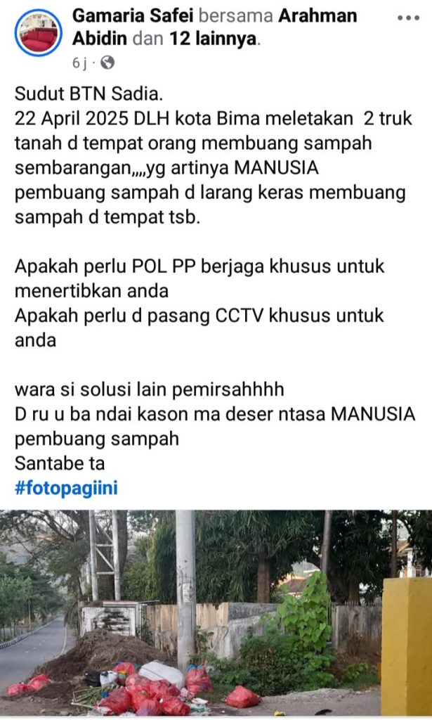 Sebelumnya media Bimantika beritakan Keluhan warga Kompleks BTN Sadia Kota Bima terkait pembuangan sampah warga di jalan masuk gang Jl. Kadondo RT 11 sama sekali tidak menjadi perhatian Dinas Lingkungan Hidup (DLH) Kota Bima.