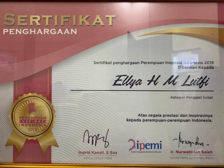 Umi Elly sapaan akrabnya mendapatkan Piagam penghargaan sebagai Penggiat Sosial oleh Ikatan Pengusaha Muslimah Indonesia (IPEMI).