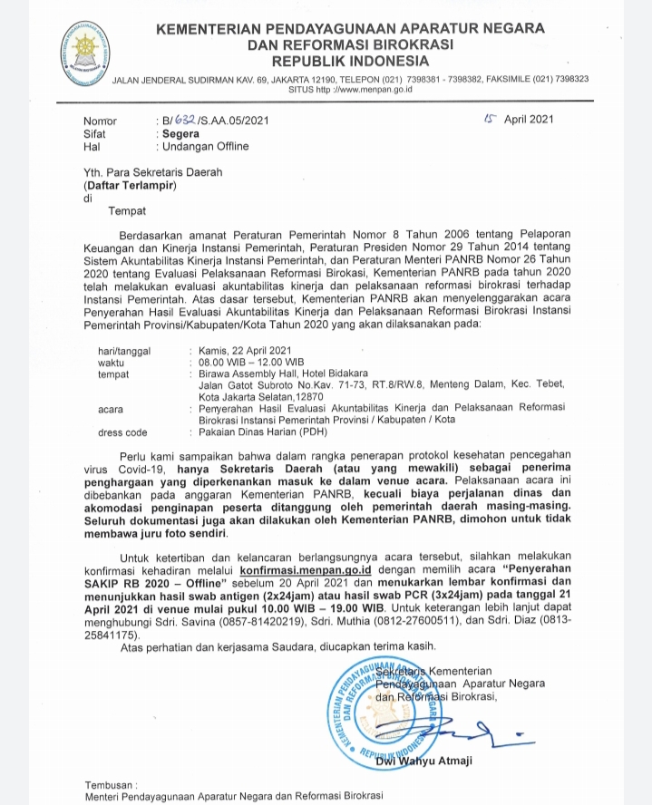 Dalam surat bernomor B/632/S.AA.05/2021 tertanggal 15 April 2021 tersebut ditandatangani oleh Sekretaris Kementrian PAN dan RB Dwi Wahyu Atmaji yang akan berlangsung pada Kamis (22/4/2021) di Birawa Assembly Hall Hotel Bidakara Jalan Gatot Soebroto Jakarta Selatan.