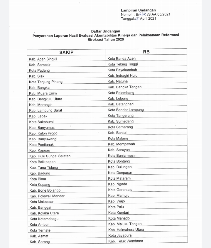 Lampiran Undangan Beberapa Nama Daerah Yang diundang oleh Kemenpan dan RB Republik Indonesia, Salah satunya KOTA BIMA