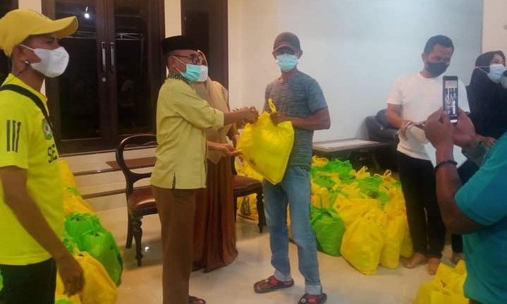 Walikota Bima H. Muhammad Lutfi, SE (HML) saat memberi Bantuan Sembako pada Ojek Kota Bima
