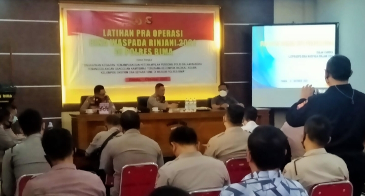 Bimantika.net Kepolisian Resor Bima Kabupaten dengan tetap mentaati protokol kesehatan menggelar kegiatan Latihan pra Operasi (Lat Pra Ops) Bina Waspada Rinjani Tahun 2021 di aula Mapolres Bima, Selasa (5/10/2021).