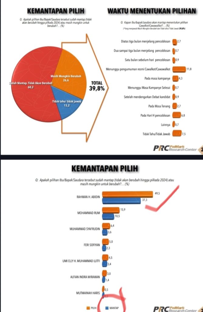 Poin penting dari hasil survei PRC beberapa waktu lalu, ada pada kuesioner pertanyaan KEMANTAPAN PILIH. apakah subyek/responden yang disurvei sudah MANTAP dengan calon yang dipilih.