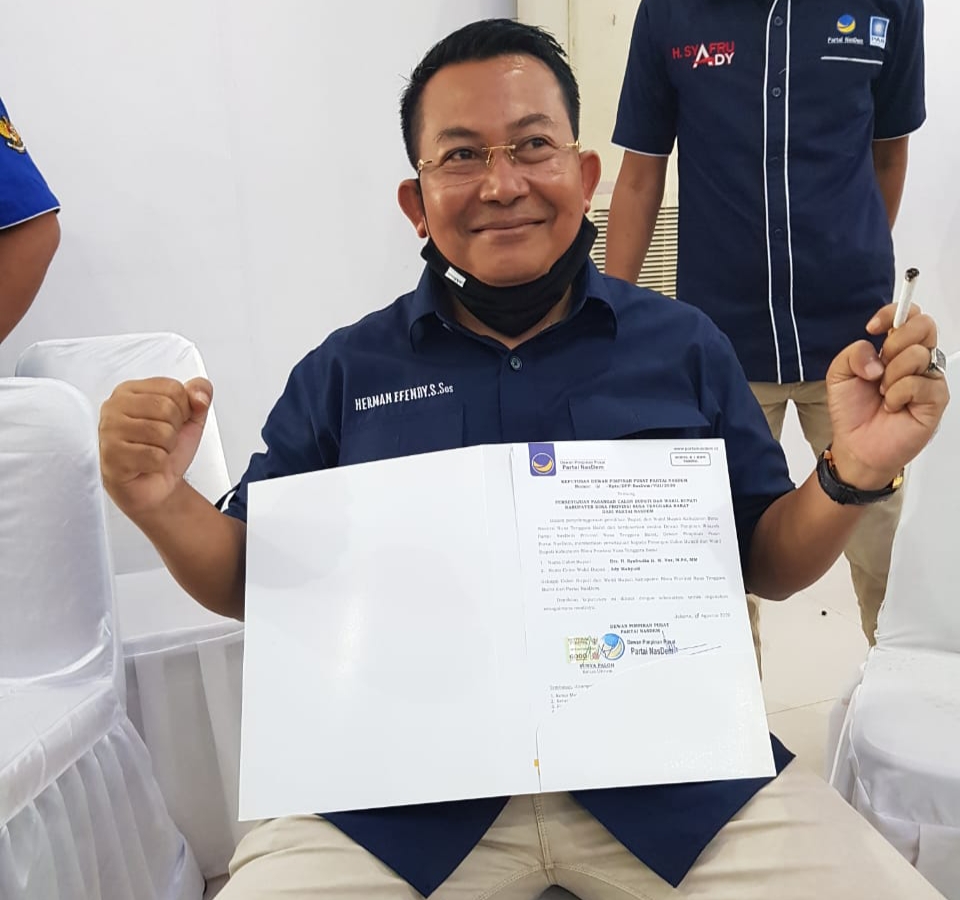 Bimantika.net,_Rabu (26/8/2020) Bakal Padangan Calon Bupati dan Wakil Bupati Bima, Drs. H. Syafrudin dan Ady Mahyudi (Syafaad) menerima SK B1KWK Partai Nasdem di Mataraam Nusa Tenggara Barat. Penyerahan SK tersebut