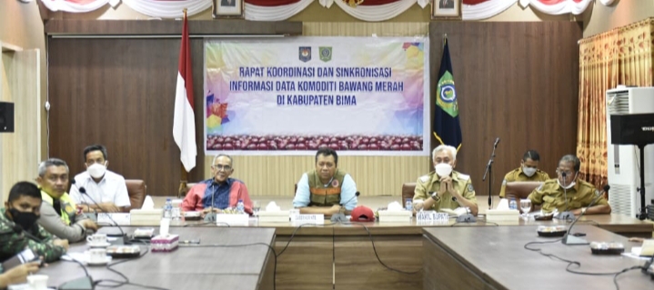 Bimantika.net Untuk menangani gejolak harga bawang yang menurun drastis dalam beberapa waktu terakhir khususnya di beberapa Kecamatan sentra komoditi bawang merah di Kabupaten Bima Senin 22 November 2021 pemerintah melalui Direktur Jenderal Perdagangan Dalam Negeri Kementerian Perdagangan RI Oke Nurwan, Gubernur NTB Dr. Zulkieflimansyah, S.E., M.Sc, Wakil Bupati Bima Drs. H. Dahlan M. Noer dan Seketaris Daerah Kabupaten Bima Drs. H.M. Taufik HAK, M.Si mengadakan Rapat Koordinasi dan Sinkronisasi Informasi Data Komoditi Bawang Merah ruang rapat utama Kantor Bupati Bima.