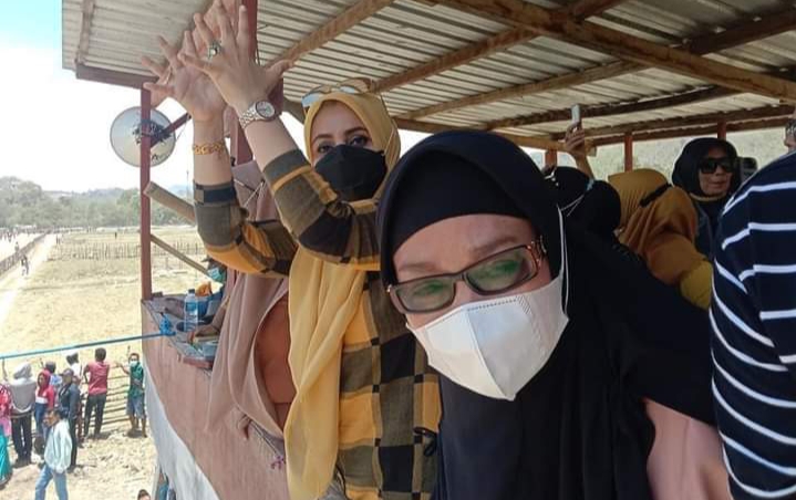 Nampak Umi Elly sapaan akrab Hj. Elly Alwaini diatas panggung tinggi riang gembira saat kuda pacu miliknya masuk dalam lintasan arena pacuan kuda.